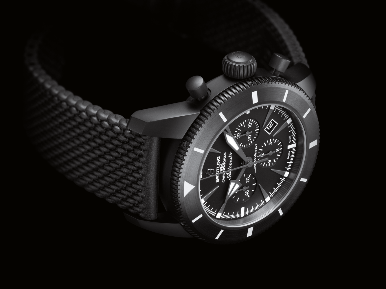 Werk: Manufakturkaliber Breitling 01 Chronoworks®, offiziell von der COSC Chronometer-zertifiziert, Hochfrequenzwerk mit Automatikaufzug (28 800 Halbschwingungen), 36 Rubine. Gangreserve von 100 Stunden. Auf ¼-Sekunde genauer Chronograf mit 30-Minuten- und 12-Stunden-Zähler. Datum. Gehäuse: schwarze Keramik (auf 100 Exemplare limitierte Serie). Wasserdicht bis 100 Meter. Verschraubte Krone. Einseitig drehbare Lünette mit Sperrkegel. Gewölbtes und beidseitig entspiegeltes Saphirglas. Saphirboden. Durchmesser: 46 mm. Zifferblatt: Volcano-Schwarz. Armband: Aero Classic-Kautschuk.